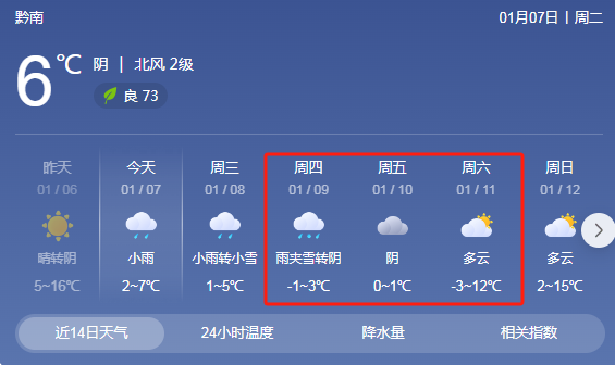 雨雪方面➤7日(今天)冻雨雪范围较小,毕节市中西部、贵阳市北部及黔南州北部夜间有冻雨或雨夹雪;