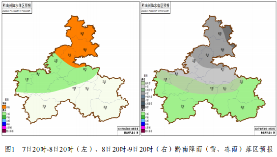 8日:阴天有小雨,气温继续下降,傍晚到夜间瓮安、福泉、贵定、龙里、都匀等地雨转小到中雪,其中瓮安、福泉部分乡镇有大雪,惠水北部、长顺北部、三都北部、平塘中北部、独山中北部等地雨转雨夹雪,伴有道路结冰和电线覆冰;