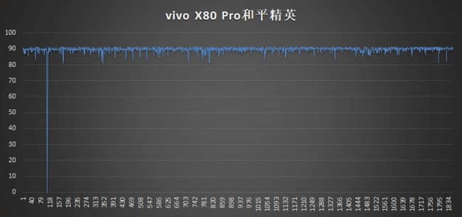 vivo X80Pro支持开启《和平精英》90帧模式,30分钟90帧模式下,vivo X80Pro整个游戏过程帧率非常稳定,无论是激烈的枪战还是开车场景,都很流畅,没有掉帧情况,实际能够稳定在89.57帧,基本上属于满帧运行了。功耗方面,平均功耗为4.68W。