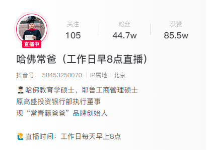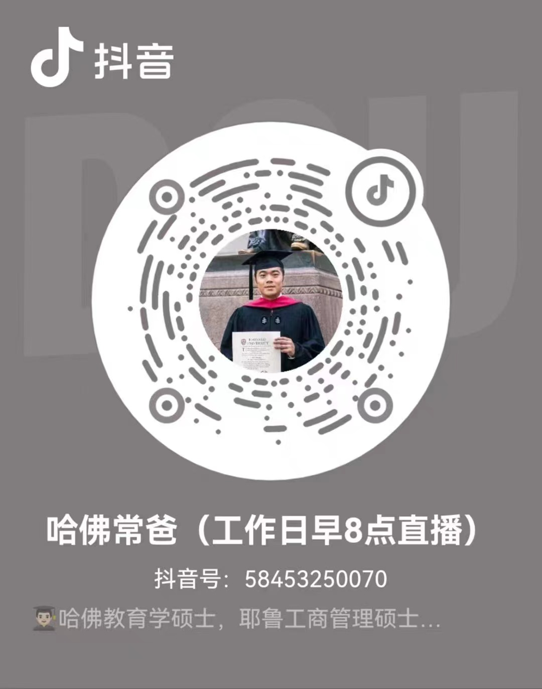 【抖音】搜索哈佛常爸(抖音号:58453250070)观看直播。(记得关注常爸直播间,不错过常爸每一次直播!)