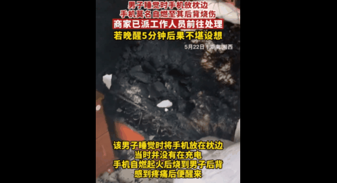 2022年5月,湖南湘西,一男子入睡前将手机放在枕边,结果熟睡时手机突然起火,男子后背被烧伤,现场一片狼藉。幸好该男子醒来得及时,没有造成过大的损失。