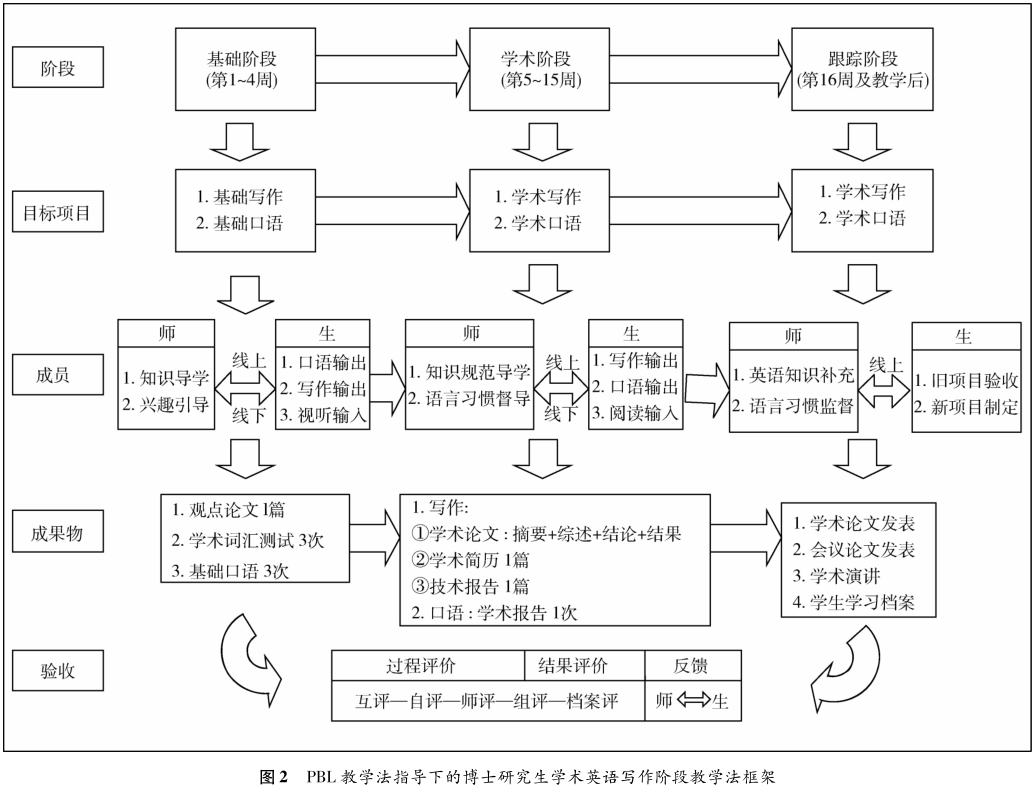 PBL教学法将博士研究生英语学习划分为三个阶段:基础—学术—追踪,灵活运用项目阶段这个目标性策略,为不同层次学生构建不同层次的项目目标,强调生生—师生—师师配合,强调学术写作外的学术口语交流,运用有效输入激发有效输出,取得良好效果。笔者教研团队经过十数年的努力,将这一教学法从雏形逐步发展成熟,再到不断打磨加强并与时俱进。期待该教学法为博士研究生英语教学,乃至硕士研究生英语的学术写作教学提供较好的理论和实践支撑。