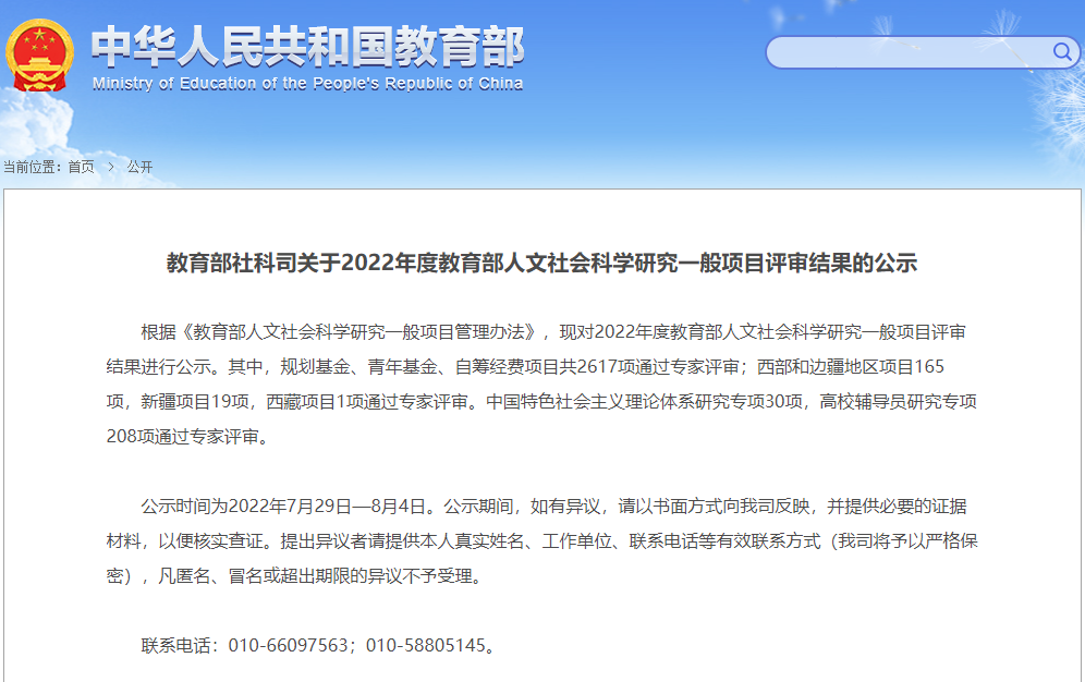 7月29日,教育部社科司公示了2022年度教育部人文社会科学研究一般项目评审结果。