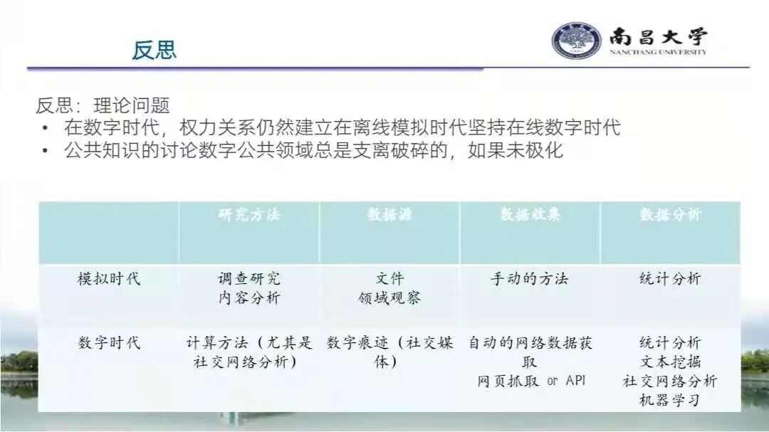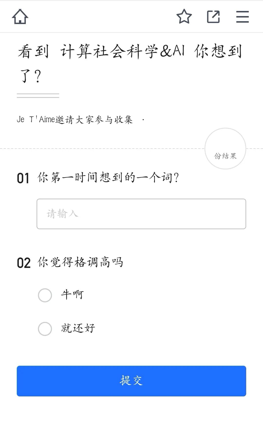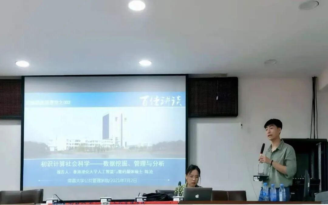香港浸会大学传理学院新闻系人工智能与数码媒体专业理学硕士,具有丰富的数字媒体传播和大数据分析经验,主要做数据新闻分析与计算社会科学研究。曾做过的项目包括中国大型企业和权威医疗机构在社交媒体中的公关实践、世界主要国家COVID-19疫苗接种率与社交媒体相关讨论情感分析的相关性、NBA社交媒体营销策略等。曾在京东集团营销运营部负责华为、宝洁等品牌的微信小程序店铺渠道拓展,创新地将销售数据按照“一周一报”进行可视化以制定营销活动计划。期间所负责产品用户数量突破20万,周GMV突破10万。网络的发展,改变了时间生活序列,大众的生活从24小时白天黑夜,变成了白天黑夜黑夜,数据分析进入生活的各个方面。什么是计算社会科学?如何进行数据分析?陈沧学长在讲座开始,向我们介绍了此次讲座所要呈现的五个方面:一、计算社会科学;二、主要主题;三、传播者、消息、渠道、受众和效果;四、数据、计算方法;五、研究案例。 进入第一部分,陈沧学长先让同学们扫描二维码,填写一份“‘计算社会科学’初印象”的问卷。计算社会科学是一个使用数字的跨学科领域数据和研究结构的计算方法,各个层次的话语、态度和行为人类社会的行动者。数字数据是指人类产生的数字痕迹和数字数据在数字设备上的行为,由数字测量或记录的“离线”动作设备。1. 文本挖掘/自动内容分析(自动语言处理和机器学习)