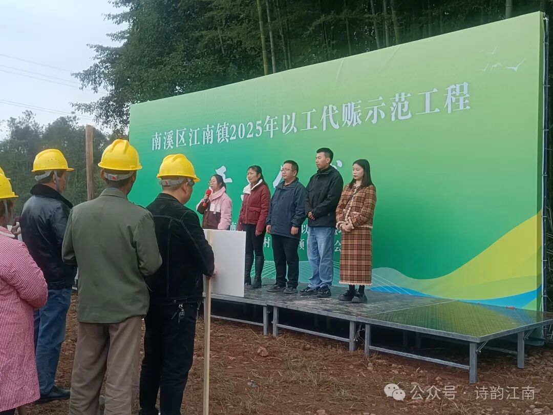 11月18日,江南镇2025年以工代赈示范工程开工仪式在江南镇大湾村隆重举行。项目村理事会成员及务工群众共计80余人齐聚现场,共同见证这一重要时刻。江南镇镇长、分管副镇长及三江新区发展政研局、南溪区发改局有关同志出席开工仪式。