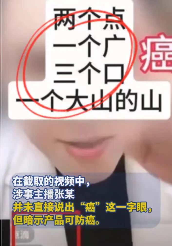 涉事主播张某此前的短视频账号拥有上百万粉丝。视频截图显示,该主播宣称“让你的家庭再也碰不到这个字,两个点一个广,三个口一个大山的山”,暗示该护肤产品的防癌功效。