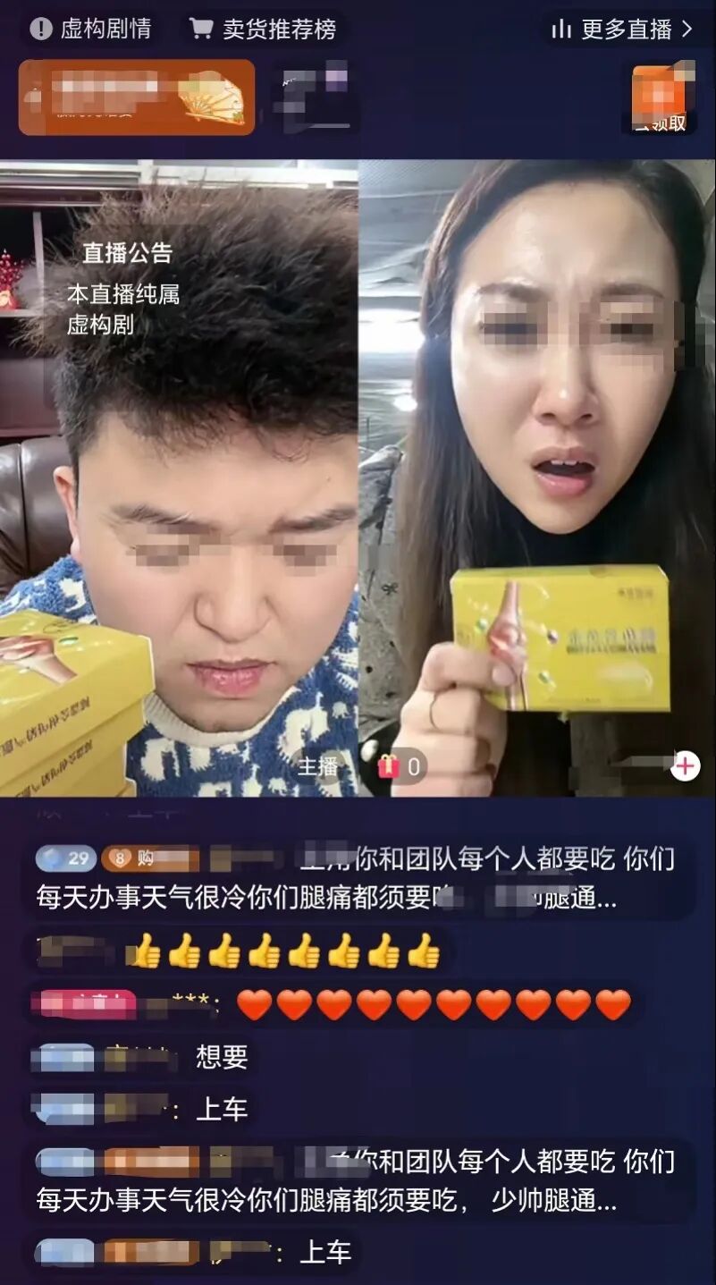 “我不要钱,就要货!”“想要货,告诉你休想!”短视频平台某直播间,上万人在围观一场抢货大战。围绕这个神秘的产品,直播间双方反复争吵、互相指责,直到人气引爆后,真实目的终于显现:观众被提醒只要是弯腰驼背的、走楼梯费劲的、晚上因为腿疼睡不着的,“都去吃”,都去下单。直播间有意暗示,该产品对解决上述身体顽疾有效。而实际上,它不过是普通食品,和治病一点也不搭边。