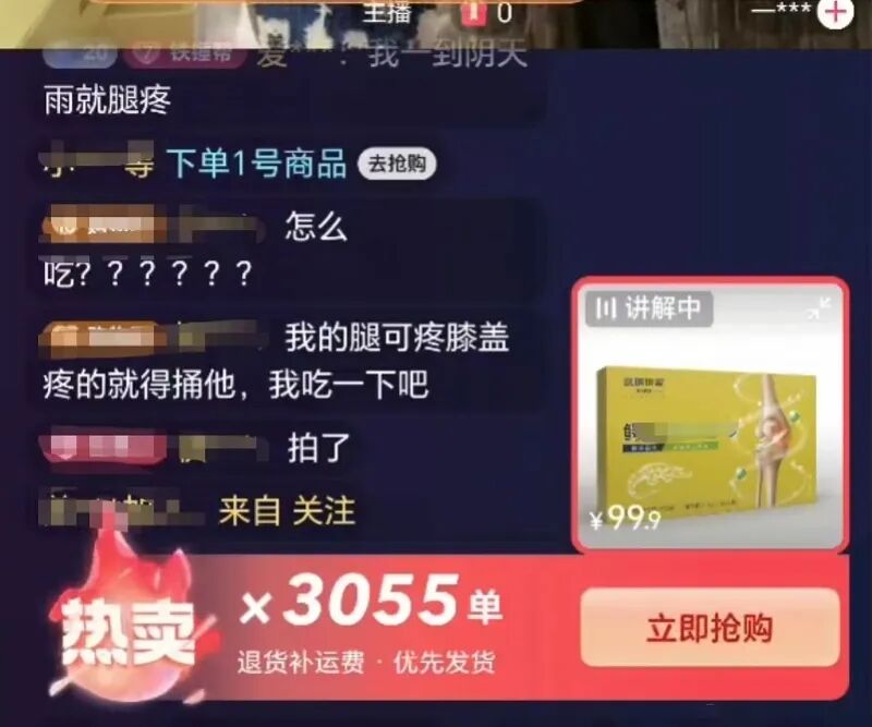 直播间的“李厂长”反复强调并作出暗示:只要是弯腰驼背的、走楼梯费劲的、晚上因为腿疼睡不着的,“都去吃,都去拍”。她还在直播间公开宣称,“我研发出来,就是为了帮助那些上楼抬不起腿、晚上疼得睡不着的人”。