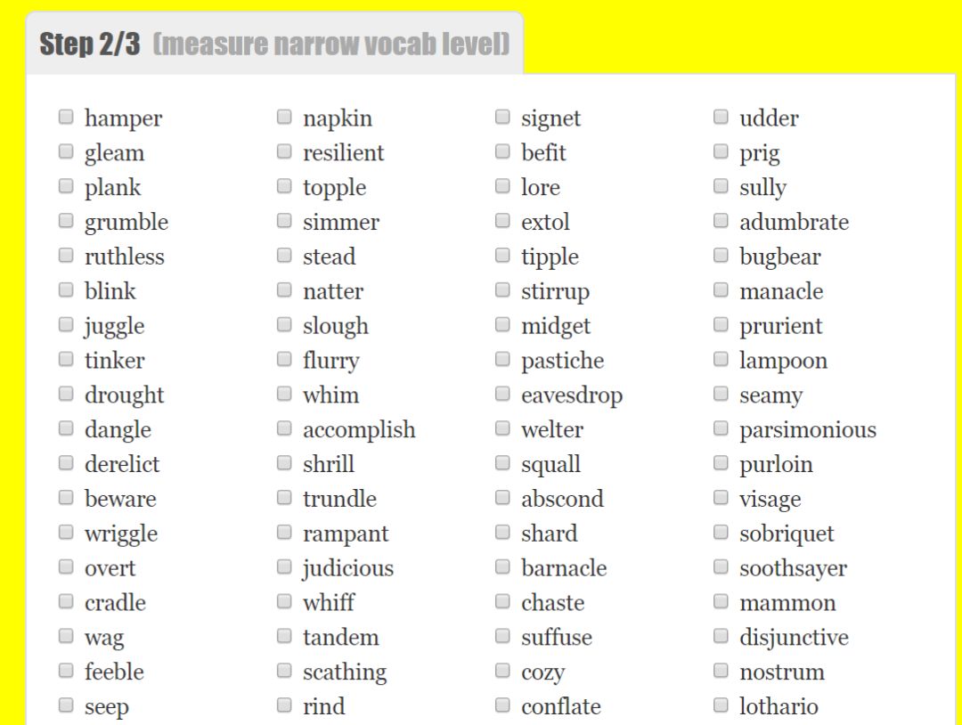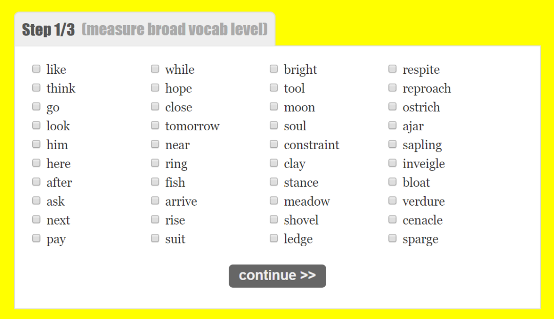 testyourvocab.com是目前比较知名的一个词汇量测试网站,我在之前的一些文章中也介绍过它。网站的操作流程很简单,测试时我们需要勾选自己认识的单词,不认识的单词不要选,单词见过但不记得意思也不要选。网站一共给出两个测试单词表,难度逐渐增加。第一个词汇表里面基本都是日常词汇,第二个词汇表难度要高很多,出现了不少GRE单词。