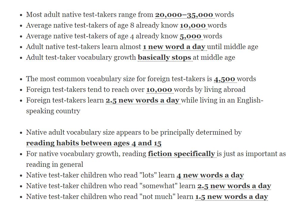 网站的博客中也提到了一些很有意思的数据,比如大部分成年英语母语者的词汇量测试结果在20000到35000之间,8岁的英语国家儿童已经能够认识约10000个单词,词汇量很大程度上由阅读习惯决定,阅读量越大的人词汇量增长越快。
