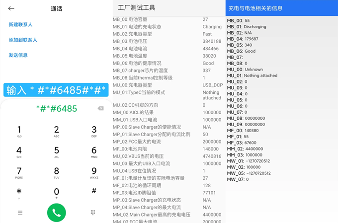在拨号界面,输入*#*#6485#*#* 指令,进入页面后查看以下值;重点是MF_05的数值除以MF_06的数值如果低于80% ,那说明电池就可以更换了,不然续航大打折扣。