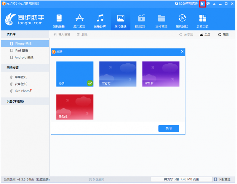 打开同步助手,进入界面,点击上方的换肤图标,自行设置软件界面皮肤;