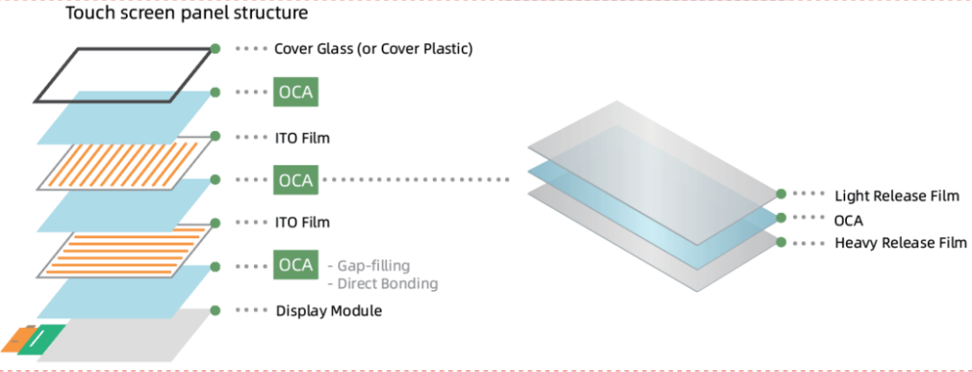 OCA光学胶(Optically Clear Adhesive),是一种用于胶结透明光学元件(如显示器盖板, 触控面板等)的特种粘胶剂,属于压敏胶的一类。作为触摸屏的重要原材料之一,OCA光学胶用作触摸屏模组粘接,以及触摸屏和显示屏粘接,可以让屏幕更清晰、更轻薄、更平整、更耐用。