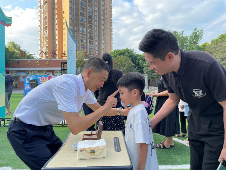 随后,老师们用毛笔在孩子们的眉心点上红色朱砂,寓意开启智慧,希望孩子们好好读书。