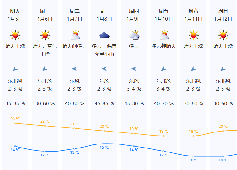 1月5日多云到晴天,早晚部分时间有轻雾或霾,空气干燥,气温14-23℃;